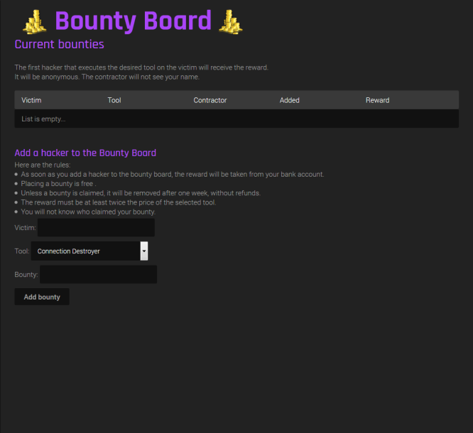 Do not impersonate other hackers or the Game Administration. If you are caught impersonating it will first result in jailtime. A second violation of this rule will get you banned.